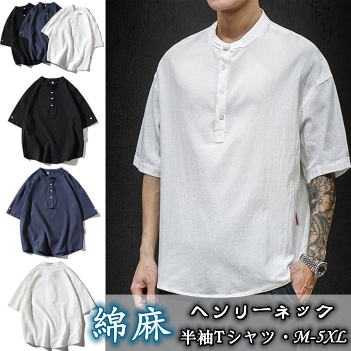 Tシャツ リネンTシャツ 半袖Tシャツ メンズ ヘンリーネック カジュアルTシャツ T-shirt M-5XL 綿麻 トップス シンプル 無地 夏物 新品