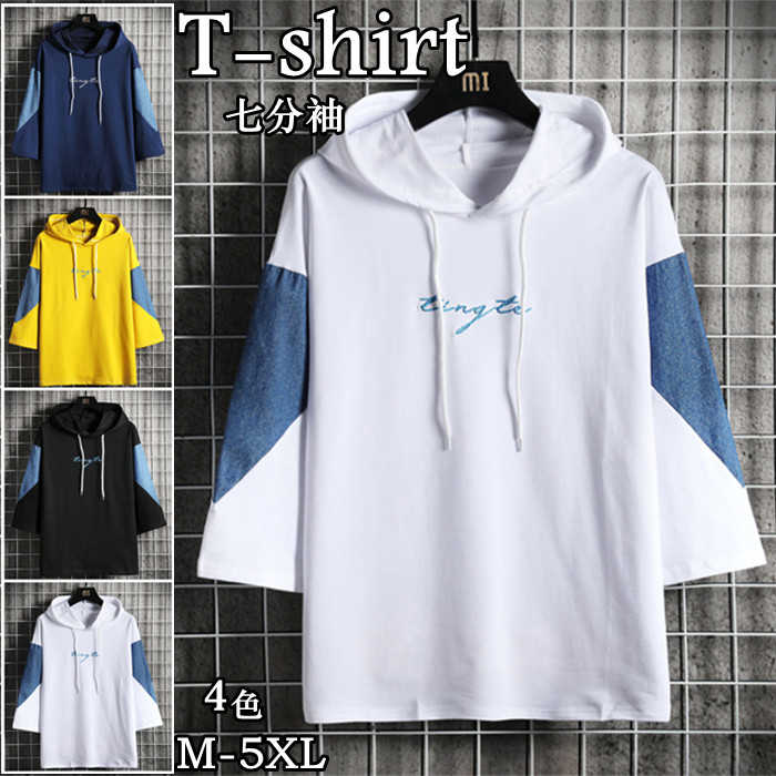 男性 フーディー 七分袖Tシャツ 切り替え柄 プルオーバーパーカー 夏服 紺 黄 黒 白メンズファッション トップス シャツ カットソー