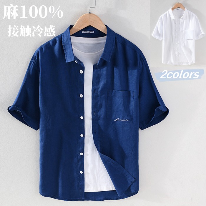 麻100% 半袖シャツ 接触冷感 カジュアル 男性用 トップス 夏物 ホワイト ブルーメンズファッション トップス カジュアルシャツ