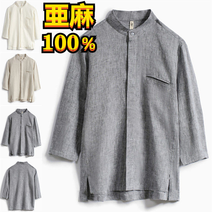 亜麻 七分袖シャツ 接触冷感 カジュアル 開襟シャツ 男性用 立ち襟 トップス 夏物 ギフト 3色 白色 灰色