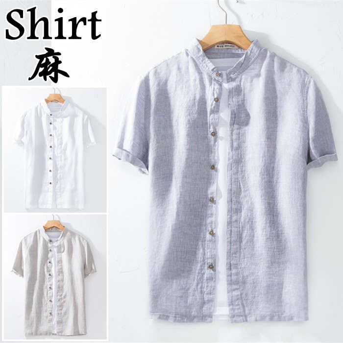 綿麻 半袖シャツ カジュアル スタンドカラー 男性用 トップス 夏服 3色 白色 灰色メンズファッション トップス カジュアルシャツ