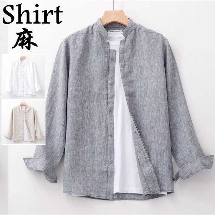 綿麻 長袖シャツ 立ち襟 カジュアル 男性用 トップス 春服 3色 白色 灰色メンズファッション トップス カジュアルシャツ