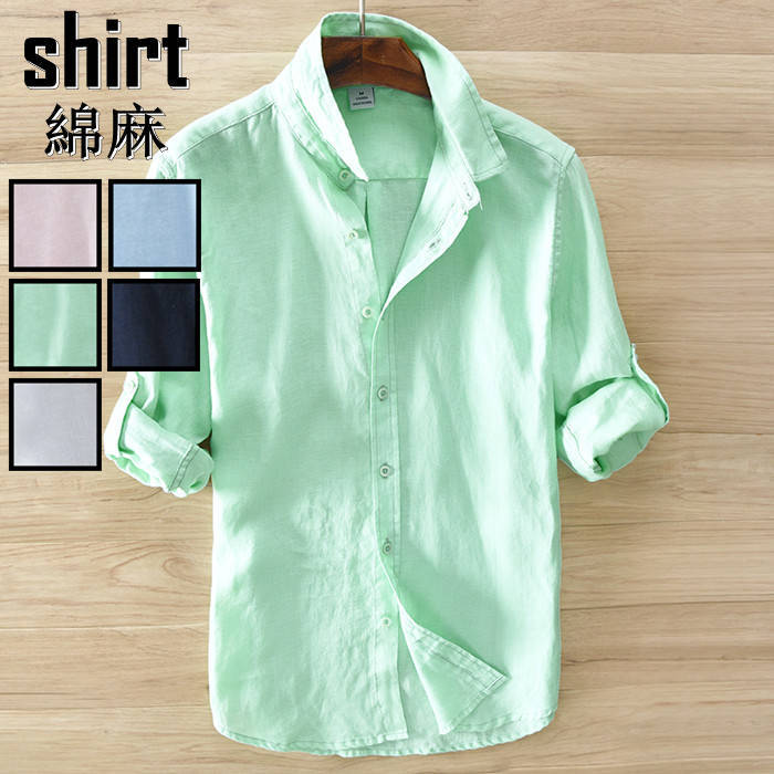 春夏服 綿麻 七分袖シャツ カジュアル 男性用 トップス 4色 紺色 水色 緑色 白色メンズファッション トップス カジュアルシャツ