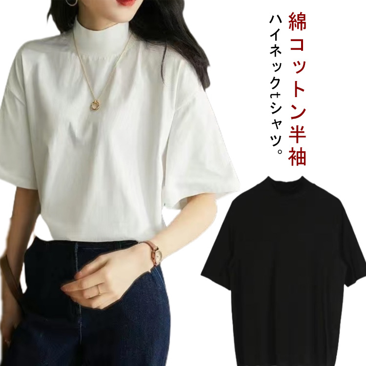 半袖Tシャツ 首のシワを隠せるハイネックTシャツ カットソー モックネック コットン tシャツ 首元隠し トップス 半袖