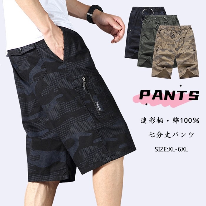 綿100% 男性用 ハーフパンツ ストレッチ クロップドパンツ カモフラージュ ショートパンツ 普段着 部屋着 夏 3色 黒 緑