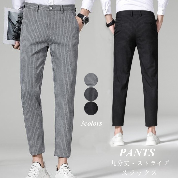 9分丈 ビジネスパンツ ハンサム ストライプ柄 スラックス カジュアル ストレートパンツ 軽量 紳士品 3色 黒色 灰色