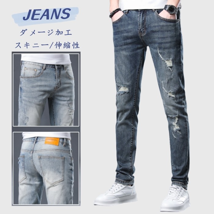 春 夏 秋 新作 美脚 ジーンズ ダメージ加工 デニムパンツ 男性用 ロングパンツ 裾上げ済み 普段着 2色 ブルー