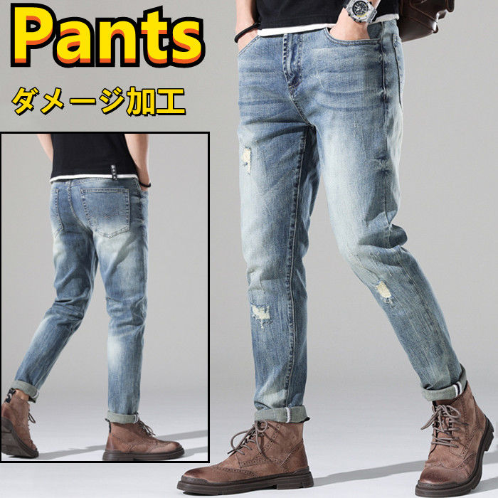 春 夏 秋 新作 ジーンズ ストレッチ ダメージ加工 デニムパンツ 男性用 ロングパンツ クラッシュ ジーパン ブルー