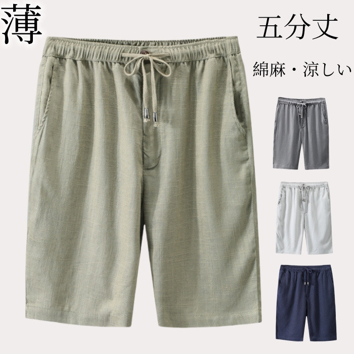 麻100% 男性用 リネンパンツ ショートパンツ 無地 ビーチ チノパン 夏 6色 白色 灰色 緑色