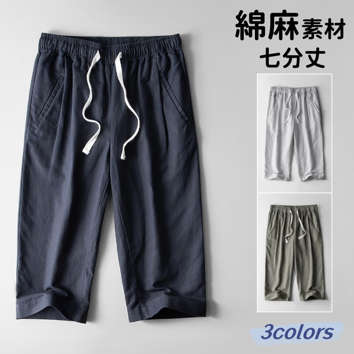 綿麻 ワイドパンツ 七分丈 カジュアル 春 夏服 ズボン 通気性 涼しい 接触冷感 ネイビー 3色メンズファッション ズボン パンツ