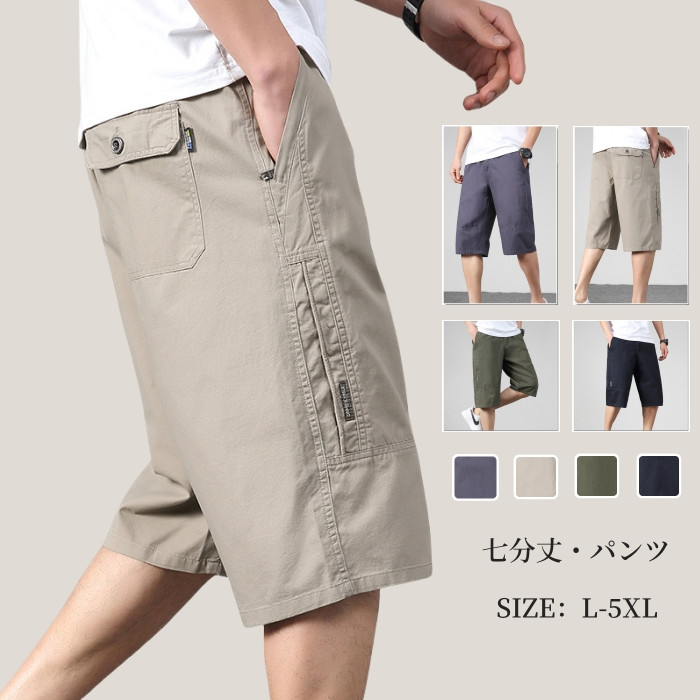 メンズクロップドパンツ サマーパンツ 無地 綿100% カーゴパンツ 涼しい 七分丈 ハーフパンツ ワークパンツ イージーパンツ ストレートパンツ ボトムス ミリタリーパンツ ウエストゴム 半ズボン