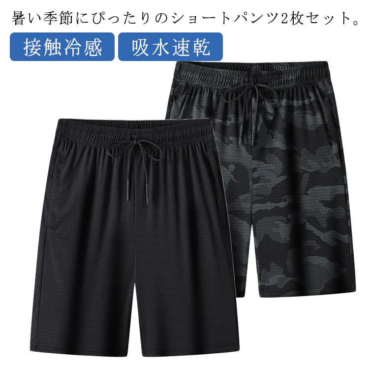 メンズ メッシュ 接触冷感 サマーパンツ 涼感 短パン 無地 ウエストゴム 半ズボン 5分丈 夏 メンズ クールパンツ 涼しい ドライ 吸水速乾 通気性 ゆったり ストレッチ 2枚セット ハーフパンツ