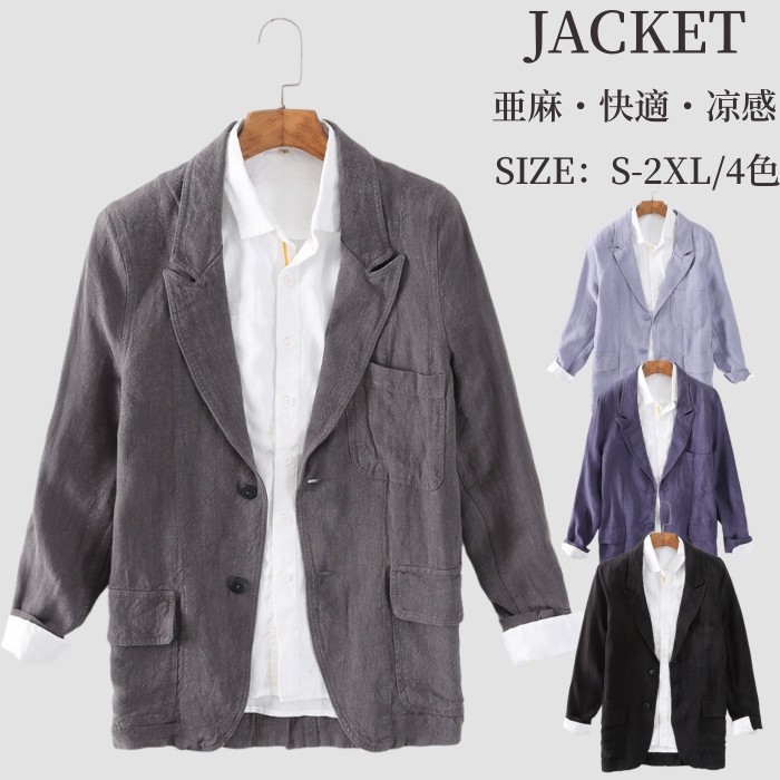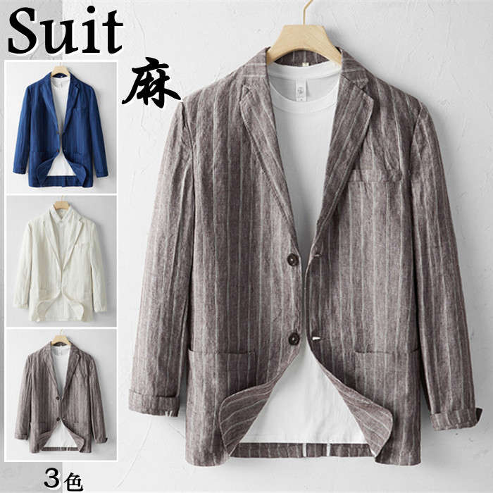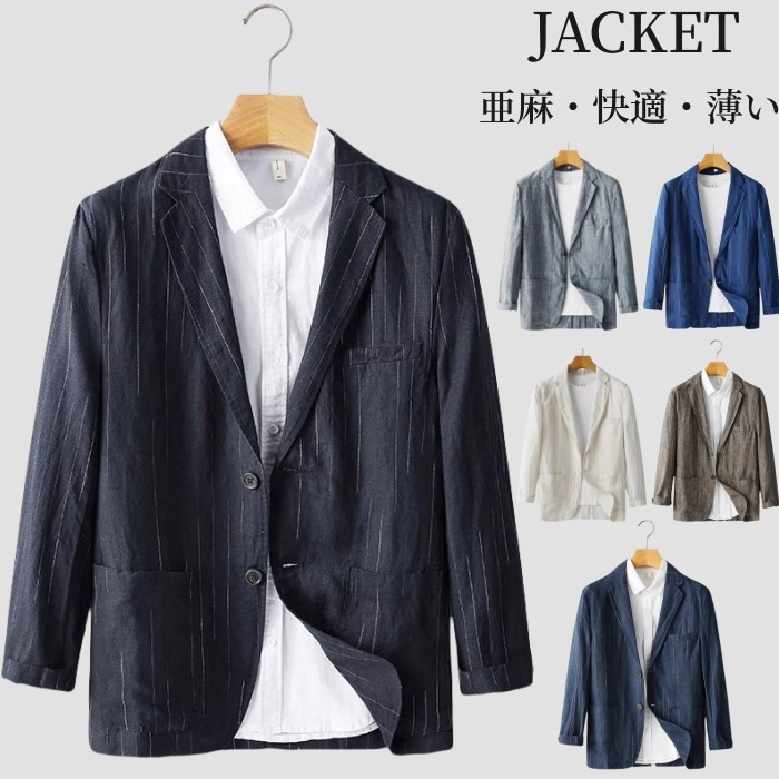 亜麻 春夏服 ブレザー 男性用 ストライプ柄 サマージャケット 薄地 4色 紺色 白色メンズファッション コート ジャケット