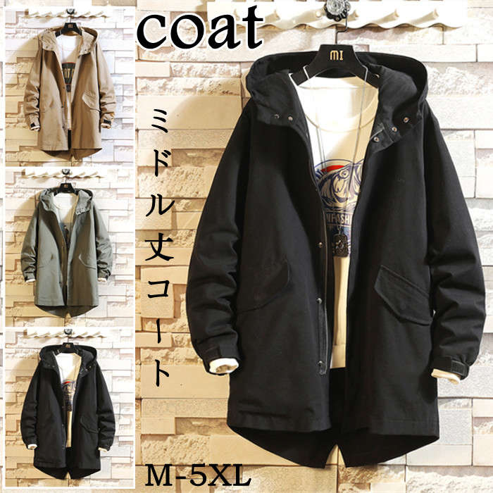 春秋服 フード付き ミドル丈コート モッズコート 男性用 トップス 3色 黒色メンズファッション コート ジャケット