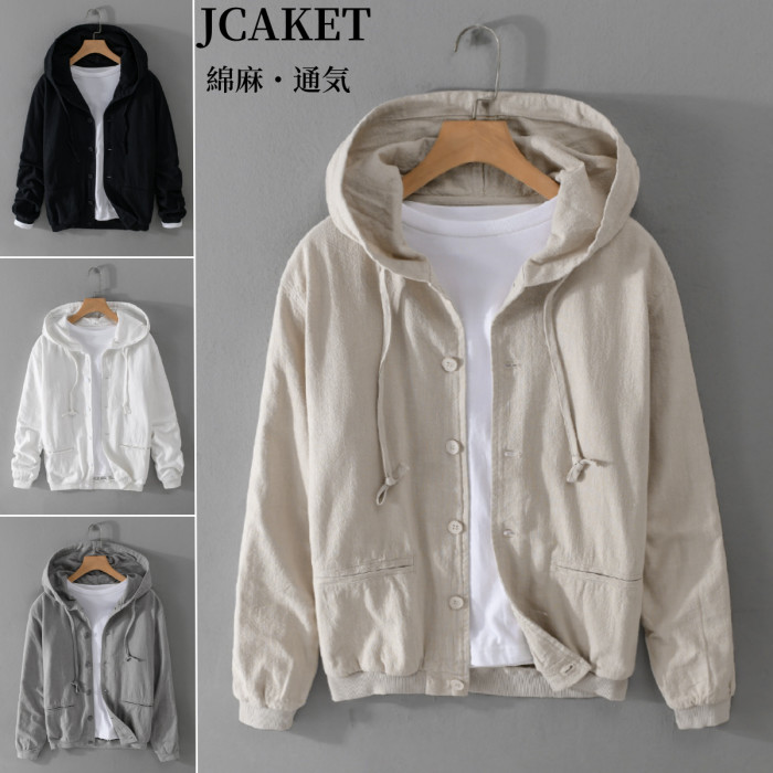 冷感 サマー カーディガン 麻綿 リネンジャケット メンズアウター カジュアルジャケット 薄地 羽織り フード付き ボタン サマージャケット パーカー スプリングジャケット 無地 細身 無地 ファッシ