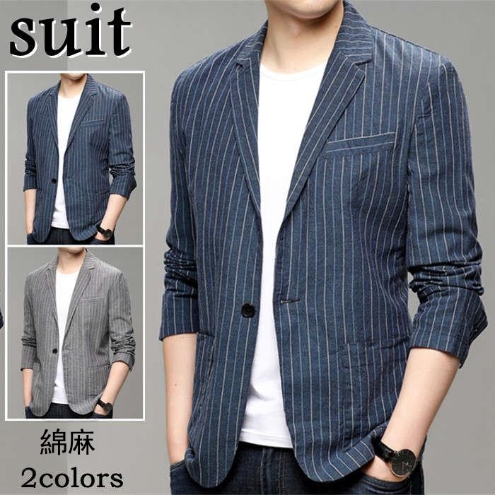 綿麻 春夏秋服 ブレザー 男性用 ストライプ柄 サマージャケット 薄地 2色 灰色 紺色メンズファッション コート ジャケット