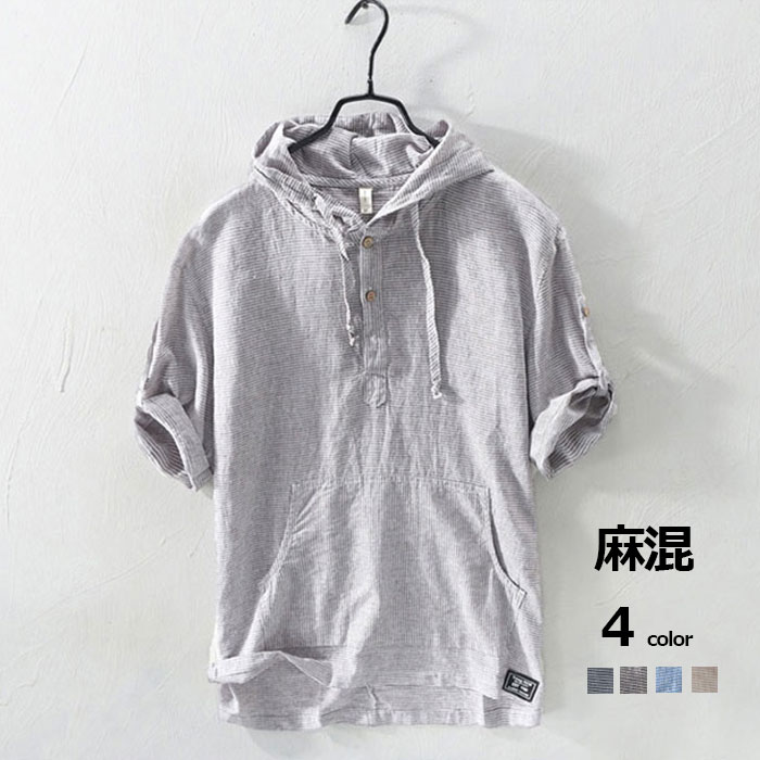パーカー プルオーバー 半袖 リネン シャツ 麻混 薄手 メンズ トップス リネン生地 リネン混 春服 春 夏 夏服 ストライプ カジュアル服 ナチュラル メンズファッション