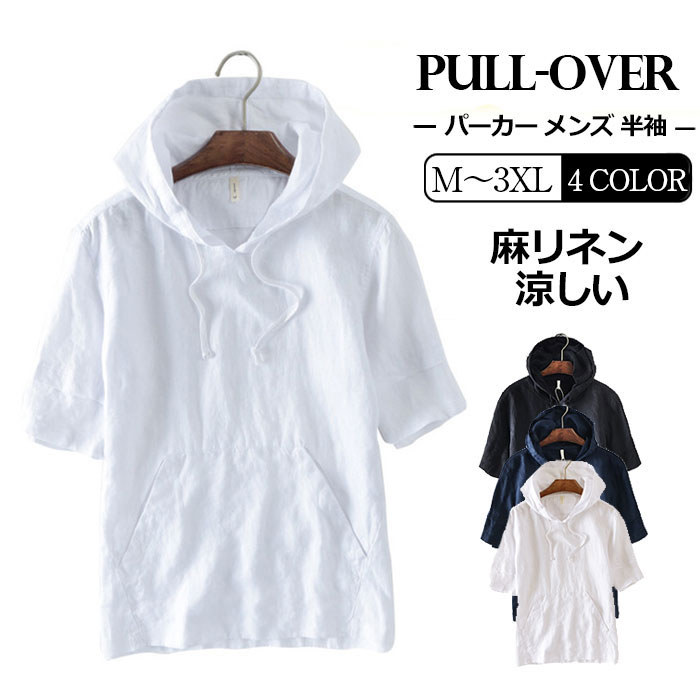 パーカー プルオーバー 半袖 リネン 麻 涼しい メンズ トップス 夏 夏服 無地 メンズファッション ブラック ネイビー ホワイト ベージュ M L XL XXL 3XL