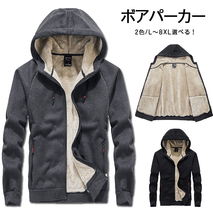 L~8XL選べる パーカー メンズ ボア ボアパーカー スウェット 裏起毛 ジップパーカー 裏ボア 裏起毛あったか 暖かい パーカー フード付き 無地 無地 カジュアル
