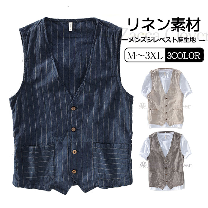 ジレ ベスト メンズ 春 夏 リネン 麻 綿 麻 コットンリネン ストライプ ホワイト ベージュ ネイビー レイヤード カジュアル スリム ショート丈 春服 夏服 おしゃれ きれいめ 上品 普段着 メ