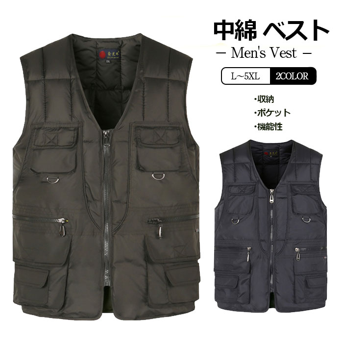中綿ベスト メンズ ダウンベスト 防寒ベスト 多ポケット 多機能 ベスト 便利 収納 ポケット 機能性 暖かい 保温 メンズベスト アウター 秋服 冬服 メンズファッション ブラック キャメル