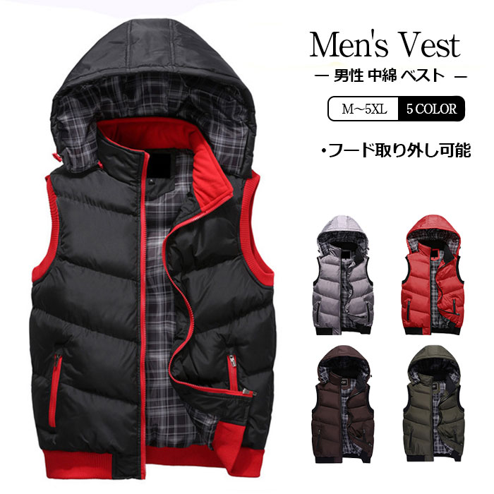 中綿ベスト メンズ ダウンベスト フード取り外しOK 防寒ベスト 暖かい 保温 メンズベスト アウター 秋服 冬服 メンズファッション ブラック レッド グリーン グレー コーヒー