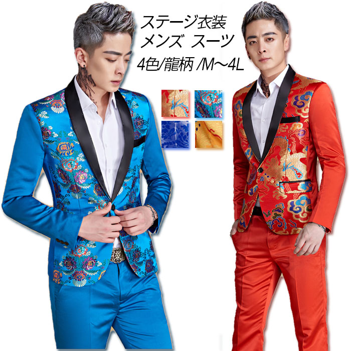 ステージ衣装 メンズ スーツ カラースーツ 上下2点セット 龍柄 花柄 忘年会 新年会 ステージ衣装 ダンス衣装 カラオケ衣装 舞台衣装 ハロウィン コスプレ 赤 青 緑 黄 ピンク