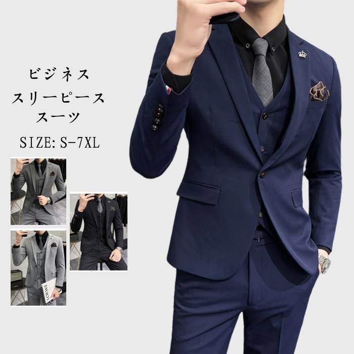 3ピース スーツ セット テーラードジャケット ロング丈 九分丈 パンツ ベスト 男性用 無地 大きいサイズ -7 6 黒色 灰色