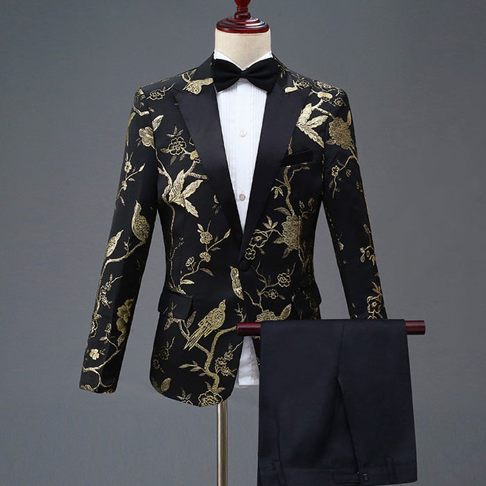 ステージ衣装 メンズ スーツ 上下2点セット スーツセット 忘年会 新年会 ステージ衣装 ダンス衣装 カラオケ衣装 舞台衣装 鳥 花 柄 金 赤 緑 青