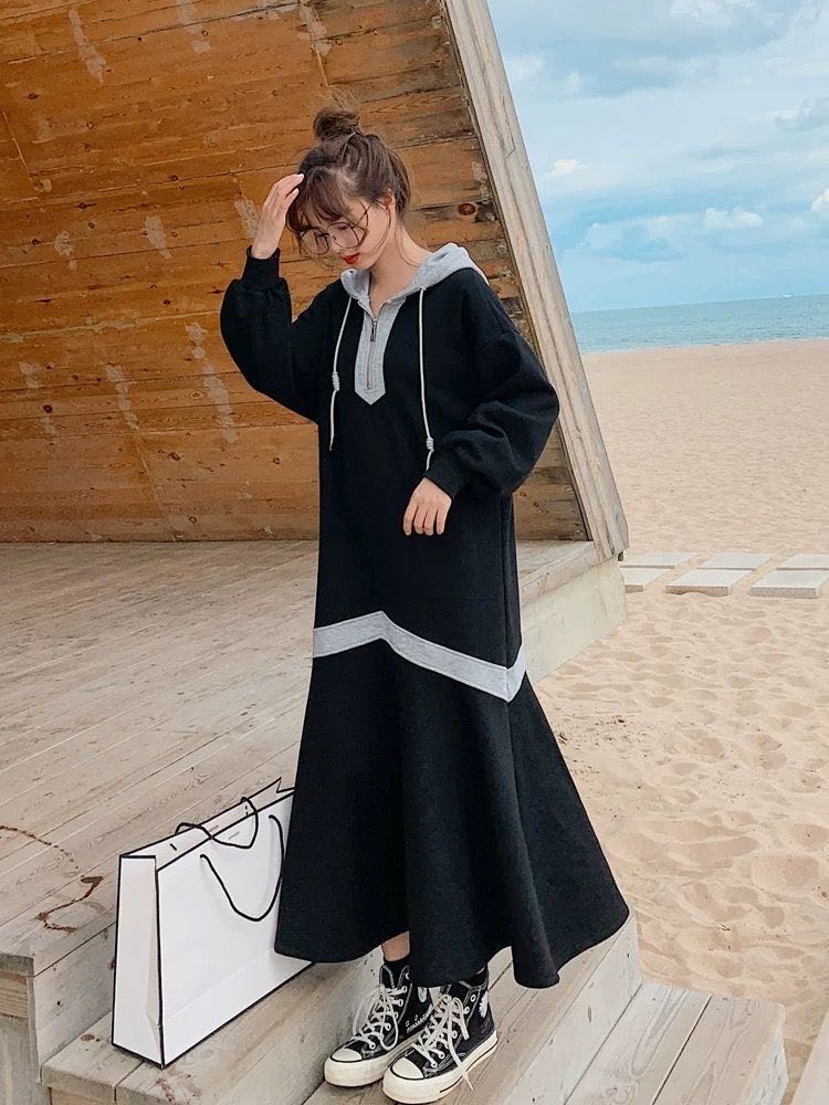 レディース ロングワンピース トレーナー ワンピース 春秋 無地 ゆったり フード付き 大きいサイズ 可愛い おしゃれ ゆったり 091