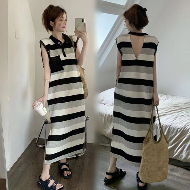 レディース ロングワンピース 夏 ボーダーワンピース ノースリーブワンピース ノースリーブワンピ ノースリワンピース バックオープン 大人ワンピース 背中開き サイドスリット 襟付き 可愛い ゆったり