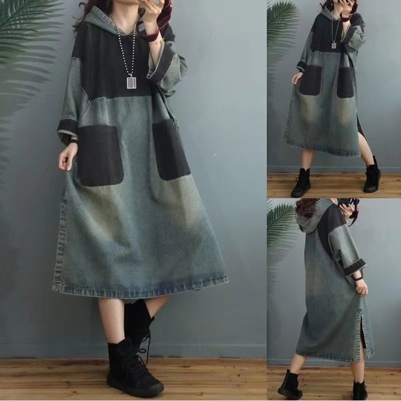 ロングワンピース レディース 春秋 ゆったり デニムワンピ 通勤 フード付き 可愛い カジュアル 大きいサイズ 2 020