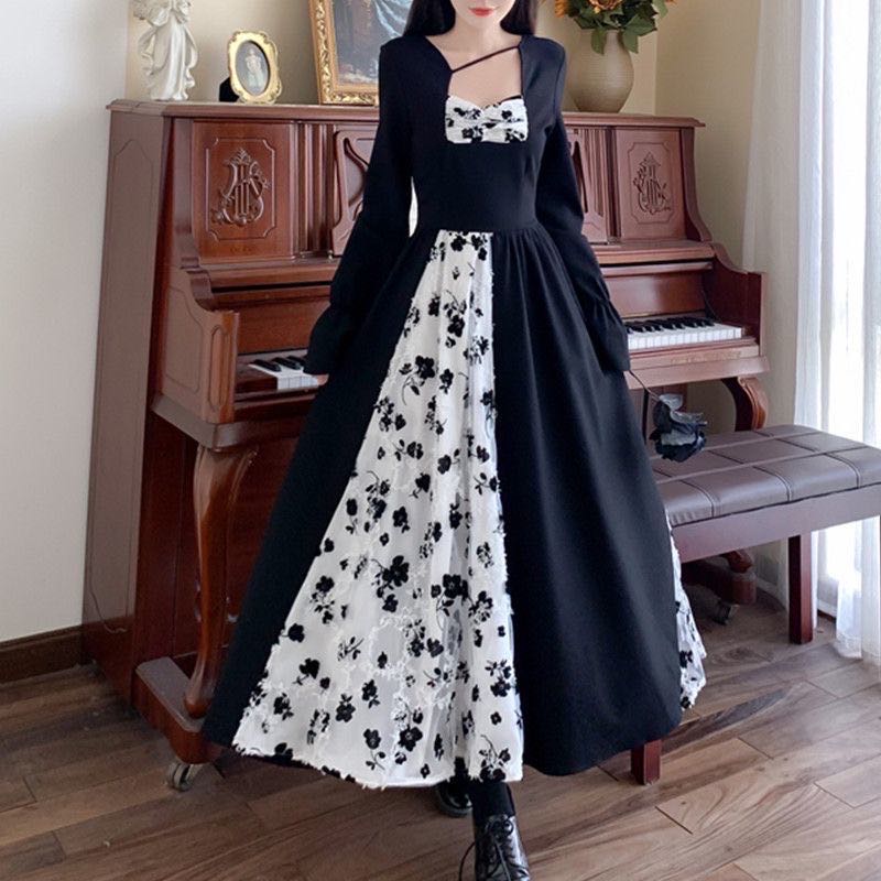 レディース ロングワンピース レディースワンピース長袖 おしゃれワンピース レイヤードワンピース ロングワンピース 黒ワンピース アシンメトリー 切替 重ね風 春 ゆったり 可愛い 春服 長袖 花柄