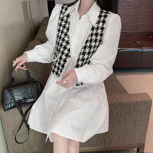 シャツワンピース 白 長袖 千鳥柄ベスト ゆったり きれいめ ボリューム袖 お洒落 Aラインミニワンピ バルーンスリーブ 大人長袖ワンピース セットアップ ジレ 韓国風2点セット春
