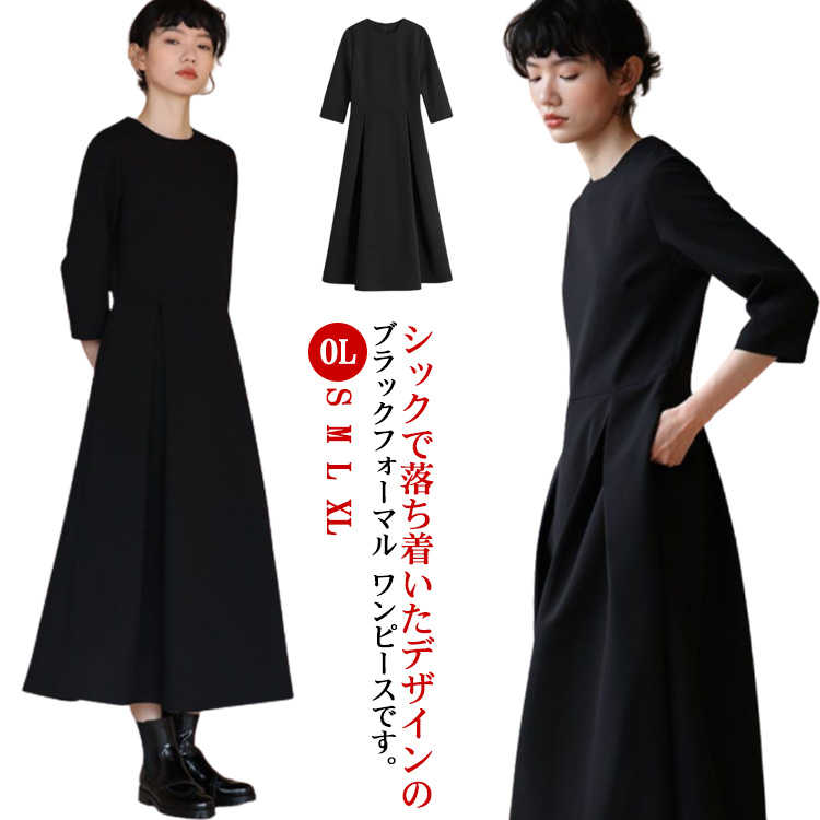 ワンピース きれいめ レディース 大人 ロング 膝下 セレモニー フォーマル タック入り 黒 体型カバー 着瘦せ 20代 30代 40代