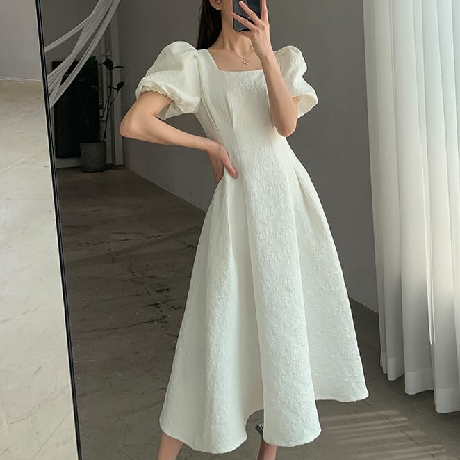 スクエアネック パフスリーブ ワンピース 半袖 ハイウエスト Aライン フレア 刺繍 モノトーン 薄手 シャガード アラベスク ひざ下丈 ミモレ丈 かわいい 大人可愛い きれいめ シンプル