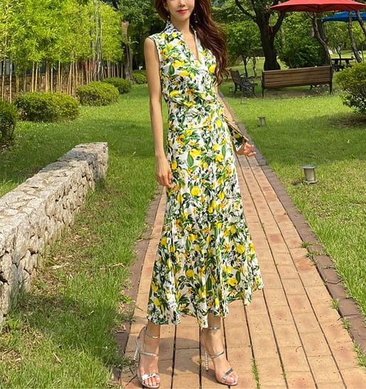 ネック ワンピース サマードレス ハイウエスト ロング丈 フレア ミモレ丈 ノースリーブ レモン柄 フルーツ フラワー 花柄 さわやか かわいい 大人可愛い きれいめ シンプル カジュアル