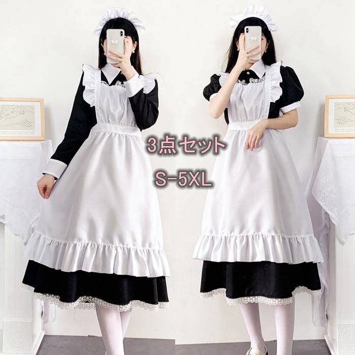 レディース メイド服 3点セット 半袖 長袖 ワンピース フリル裾 ロング丈 ショート丈 ハロウィン 衣装 チェック柄 コスプレ パーティー プレゼント