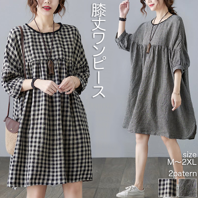 パフスリーブ ワンピース ミニ ひざ丈 5分袖 ギンガムチェック チュニック ラウンドネック 襟なし サイドスリット チェック柄 夏 10代 20代 30代 ママ会 お出かけ 女