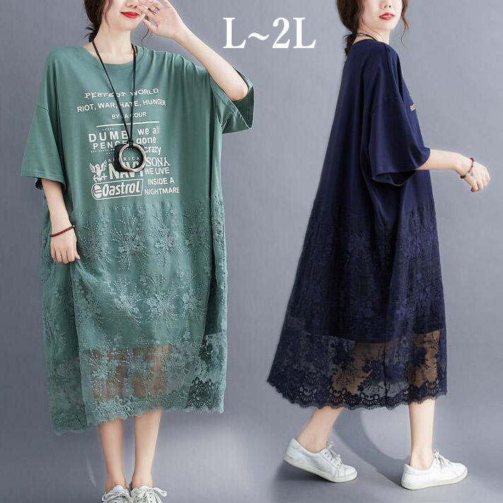 レース花柄刺繍レースtシャツゆったりワンピースロロングTシャツ レースワンピース Tシャツワンピースチュニックロゴプリント半袖膝丈ミディアム夏L 2L