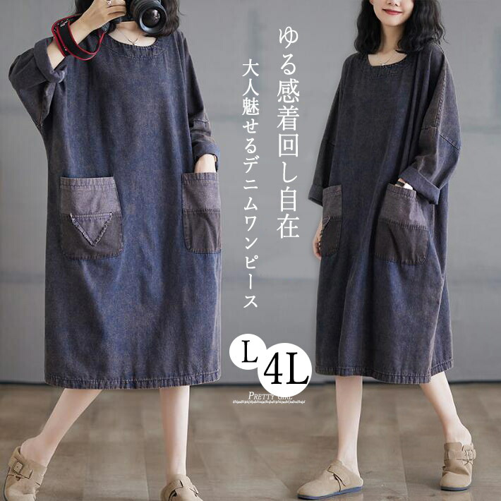 デニムワンピースレディース ミモレ丈長袖大きいサイズ切替ワンピAラインデニムマキシ丈ロング体型カバー 春秋L2L3L4L