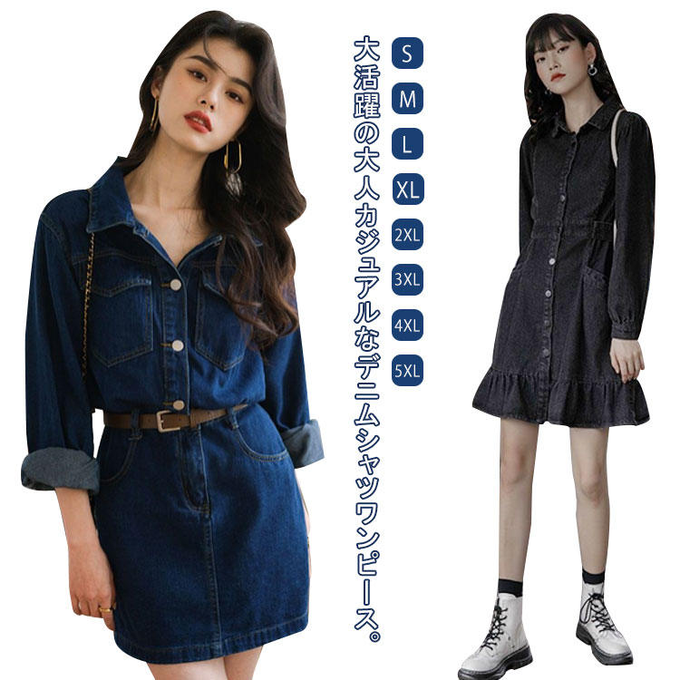 タイト レディース 長袖 デニム タイトワンピース シャツワンピース ロングワンピース 美シルエット 可愛い 大きいサイズ ひざ丈 デニムシャツ 春服 デニムワンピース 秋 無地 体型カバー カジュア