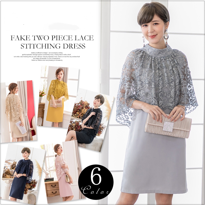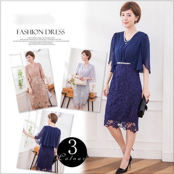 パーティードレス ワンピース ビジュードレス ミディアムドレス レース シフォン ドレープ 袖有り 膝丈 ハーフ丈