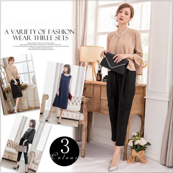 3 セットアップ ブラウス パンツ ワンピース パーティードレス 袖有り 七分袖 パンツ パーティー ブライダル ウェディング オフィス フォーマル ミセス