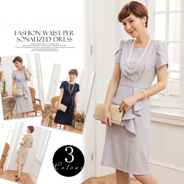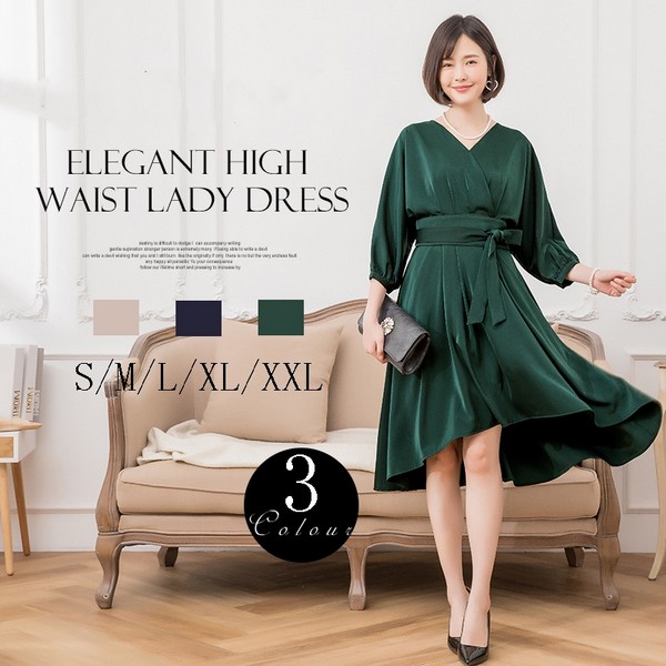 パーティードレス ライン ラッフル袖 ハイウエスト ブライダル ウェディング オフィス デート 大きいサイズ 着痩せ 体型カバー