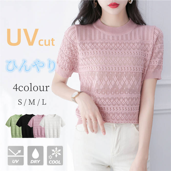 爽やかな印象を与えてくれる ひんやり 接触冷感 透かし編みニット トップス ブラック ホワイト グリーン ピンク パーブル 黒 白 20代 30代 40代 50代 春夏 ♪