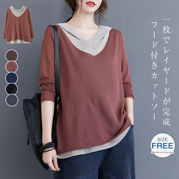 重ね着をしてるようなデザインカットソー おしゃれ 人気 シーズンレス 長袖 重ね着風 オールシーズン