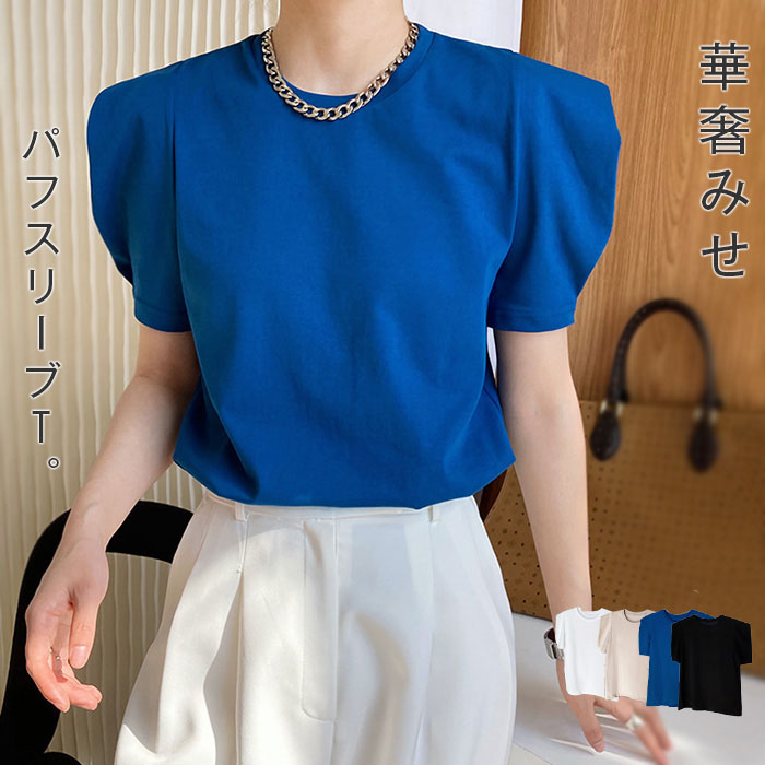 カットソー 半袖 レディース きれいめ トップス シャツ パフスリーブシャツ シャツ 無地 ゆったり カジュアル コットン ブラック ホワイト 白 シンプル