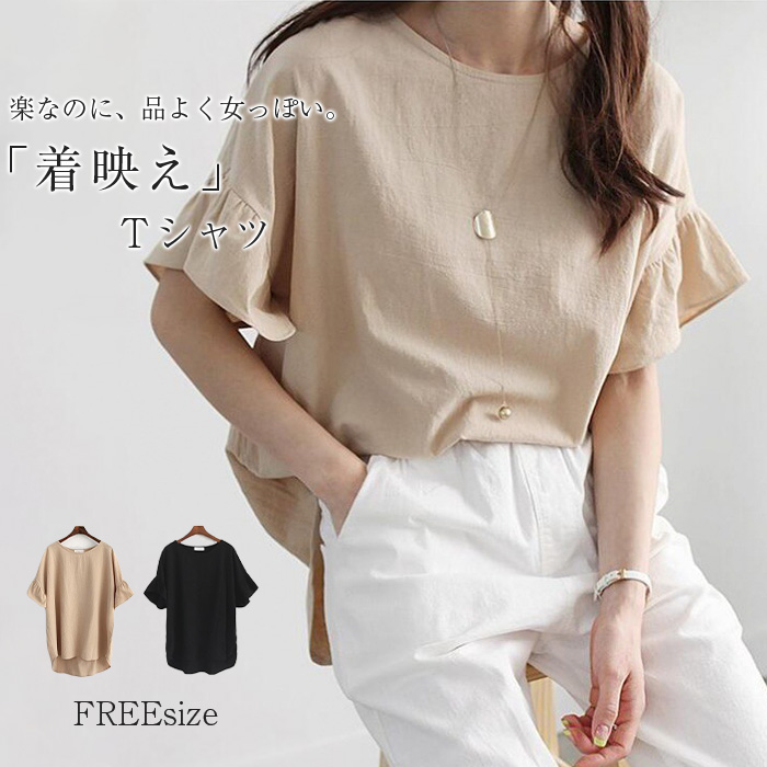 大人気ほどよい甘さの袖 Tシャツ カットソー レディース 春夏 半袖 フリル 無地 ギャザー シンプル