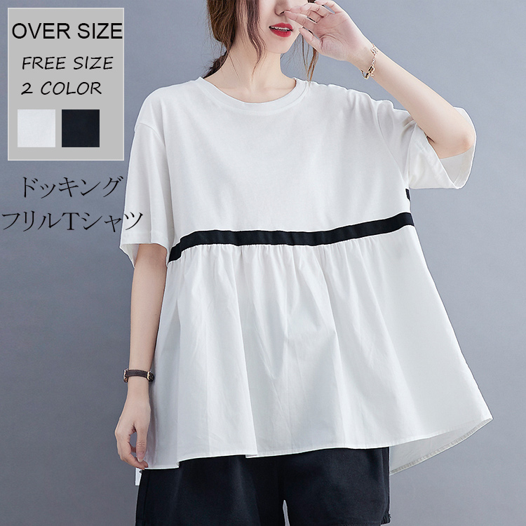 ドッキングシャツ ブラウス トップス tシャツ レディース 春夏 切り替え ドッキング チュニックシャツ 大きい 短袖 ギャザー 体型カバー フレア ブラック ホワイト 黒 白